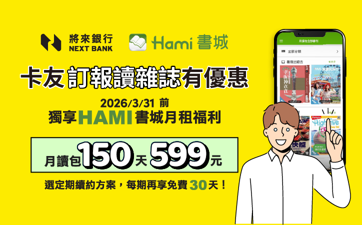 用將來銀行「將將卡、大將卡」訂閱150天月讀包,暢讀書報雜誌只要$599元