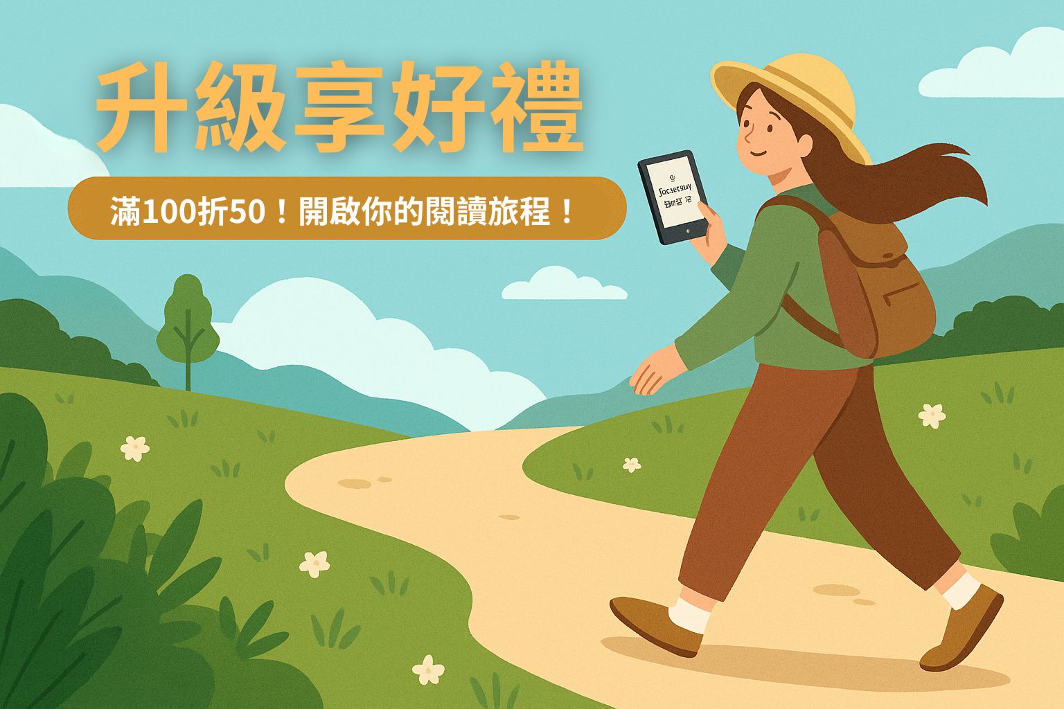 只要滿100折50元,輕鬆入手心儀好書。無論你喜歡的是理財的智慧、人文的深度,還是小說的浪漫與想像,這裡都有讓你前行的能量。就像畫面中的夥伴們,手持閱讀器,一起走在知識的山路上,每個人都朝著更豐富的自己邁進。