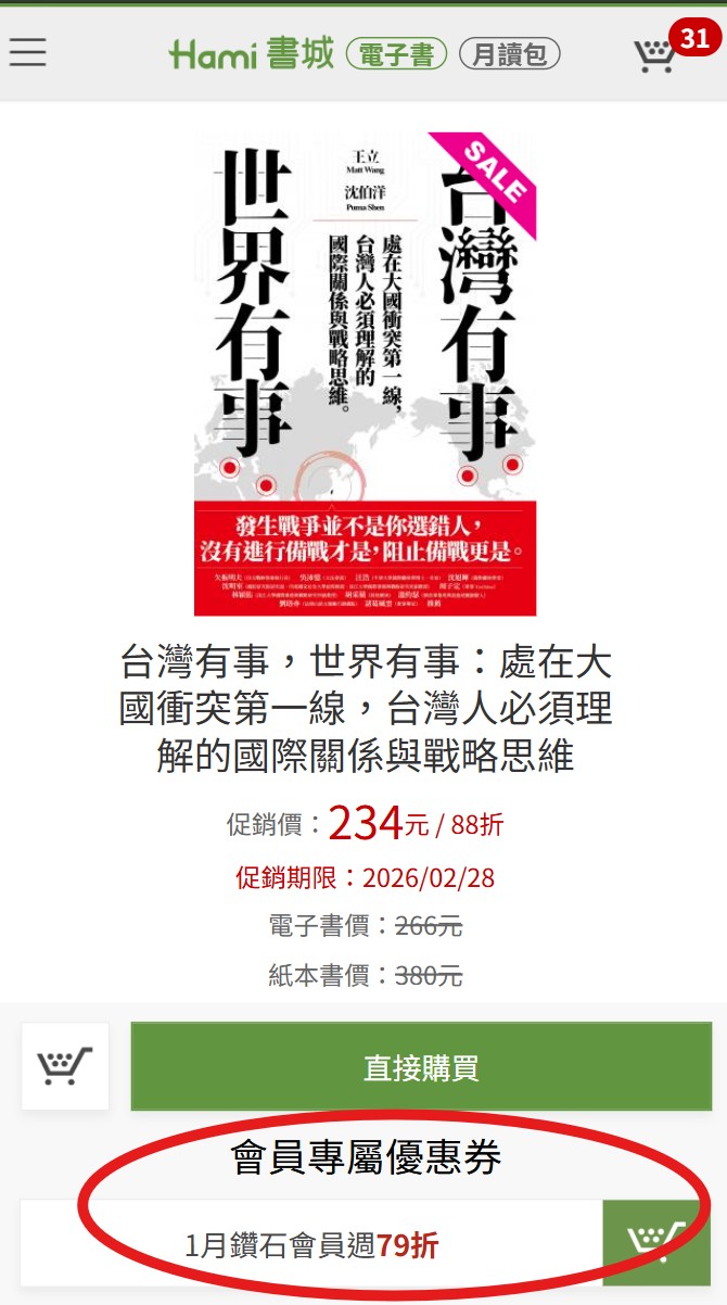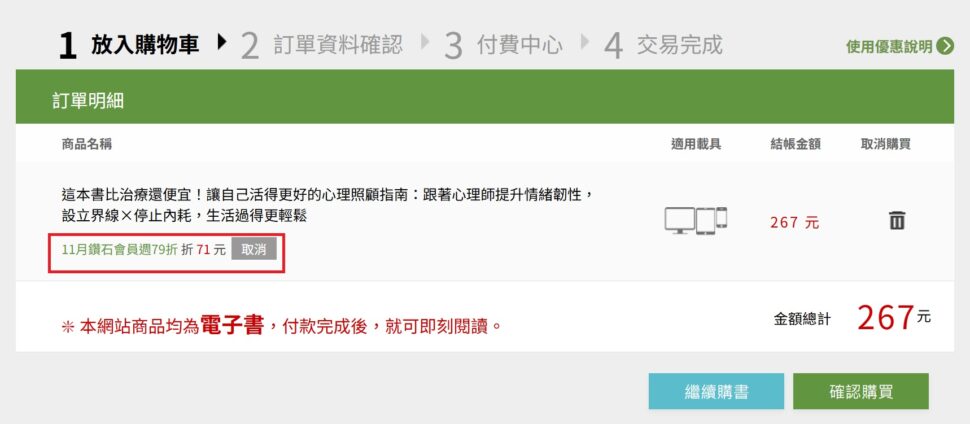 三、進入購物車後,確認書籍已綁上專屬的會員折價券。即可進行購買流程